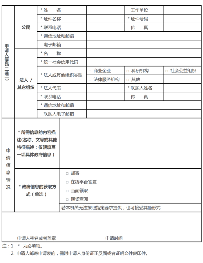 3、申请表应准确载明申请人的姓名或者名称、联系方式、获取政府信息的方式及其载体形式。所需政府信息内容描述应当指向明确,建议详尽提供特定政府信息的文件名称、文号或者其他有助于确定信息内容的特征描述。