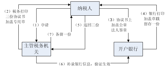 第一步:持税务登记证件和银行“开户许可证”至办税服务厅申请签订三方协议(税务机关打印一式三份,在其中一份加盖“三方协议专用章”),经办人员核对信息并签字确认。