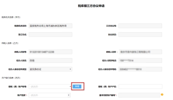 点击【手工录入银行账户信息】,系统跳转至税库银三方协议申请页面。系统自动带出税务机关信息(甲方)、纳税人信息(乙方)相关信息。用户可手工录入开户银行信息(丙方)信息。