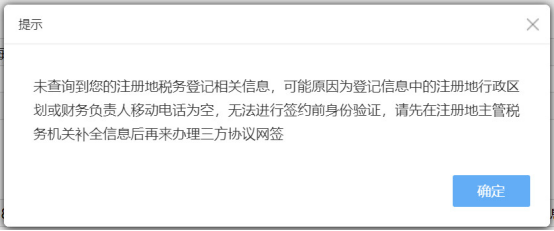 如果系统未查询到财务负责人信息,会弹出提示。遇到此种情况,请纳税人前往注册地电子税务局检查税务登记信息中注册地行政区划、财务负责人移动电话是否正确,如果有缺失,请先在注册地电子税务局补全上述信息后,再回到上海电子税务局提交网签三方协议的申请。