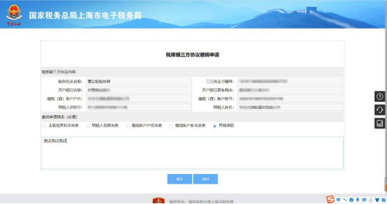 点击【确定】将跳转至三方协议撤销界面。需要用户根据实际情况选择撤销三方协议的原因。如果申请理由中没有,请选择【其他】原因,并在下方文字输入框内输入具体的理由。填写完毕后,点击【提交】按钮。