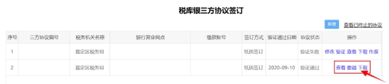 在银行办理完成后,可点击税库银三方协议签订界面上的【验证】按钮发起协议验证。验证通过后协议即可使用。