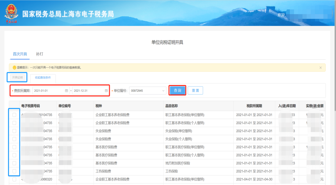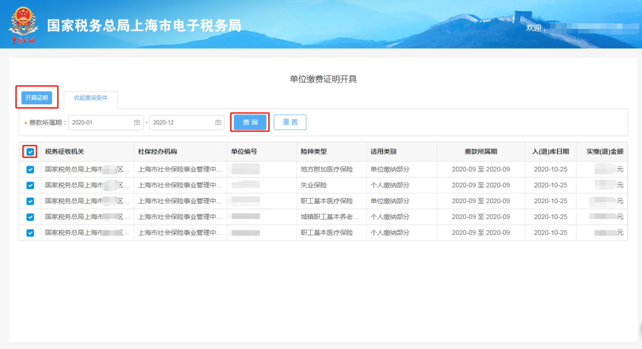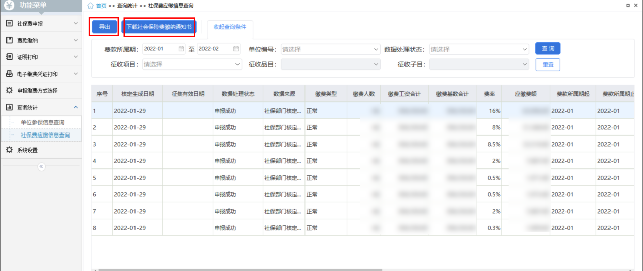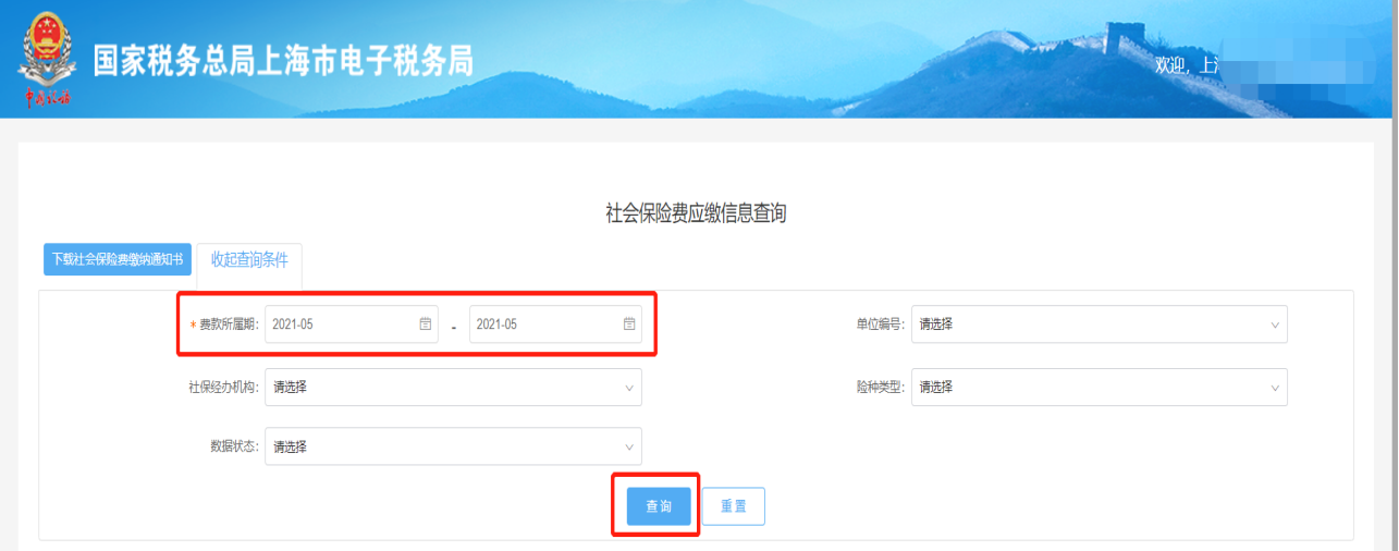 选择要查询的费款所属期,点击“查询”,即可查询出对应的缴费信息。点击左上角蓝色按钮可下载社会保险费缴纳通知书。