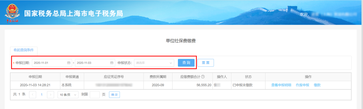 ②在【单位社保费缴费】界面中选择申报日期及申报状态,点击“查询”。系统将已申报未缴款的社保费申报明细查出。