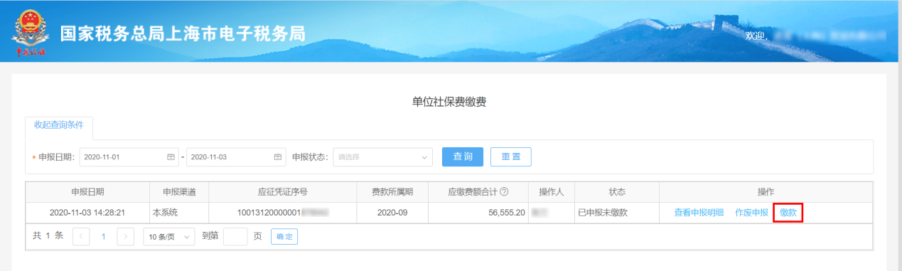④申报成功后系统会自动跳转至【单位社保费缴款】界面。