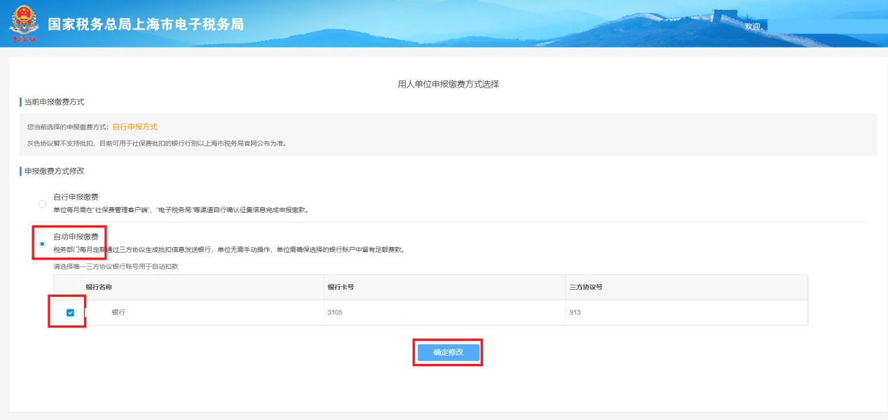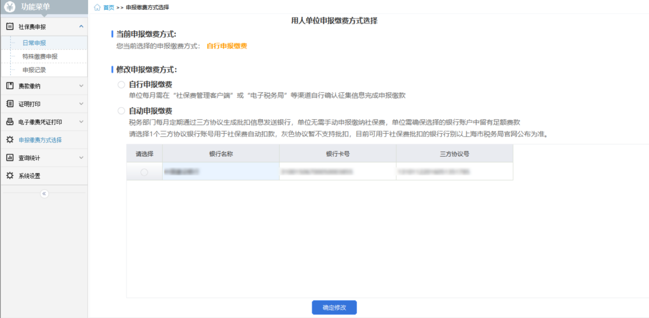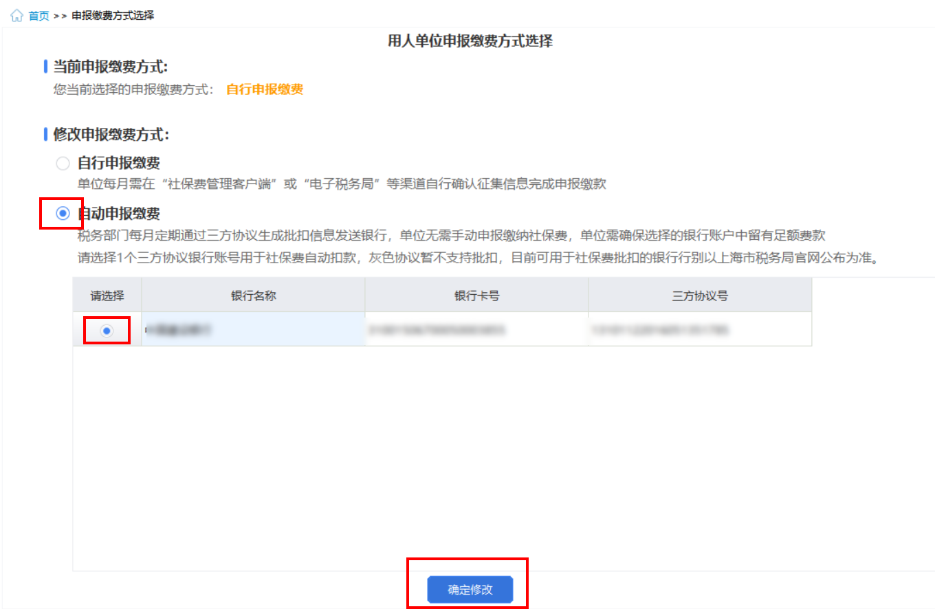 【用人单位申报缴费方式选择】界面中,选择“自动申报缴费”,勾选三方协议银行账号后,点击“确认修改”。