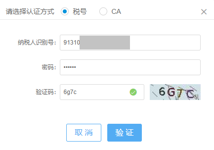 选择认证方式:税号认证/CA认证。选择税号认证,输入纳税人识别号、密码、验证码后,点击“验证”。