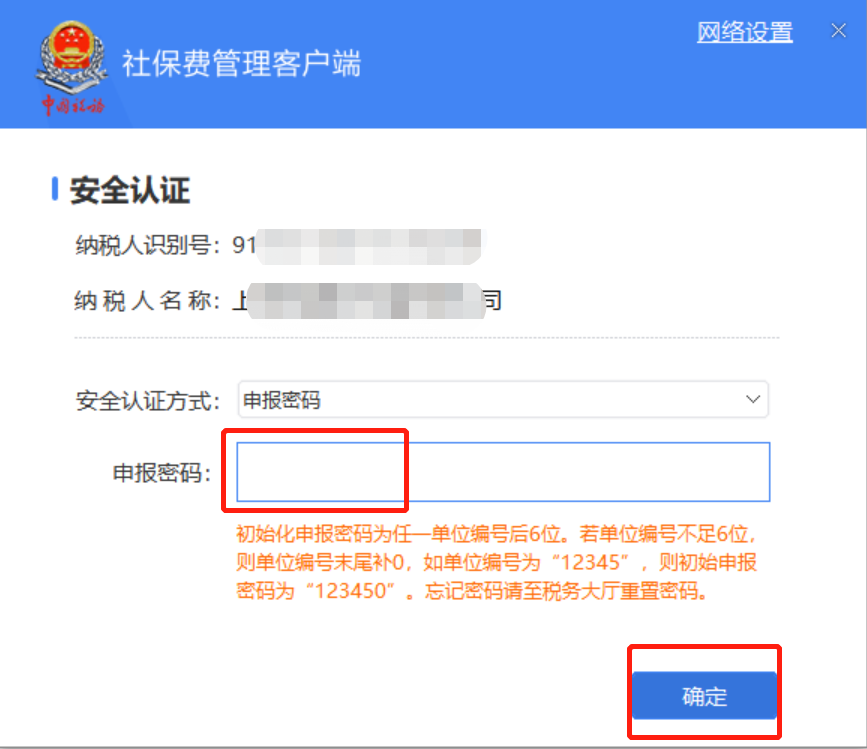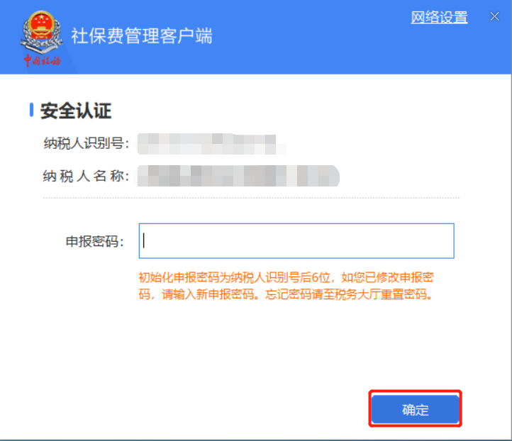 ②安全认证。在“申报密码”栏输入代收单位的社保费申报密码,点击“确定”;