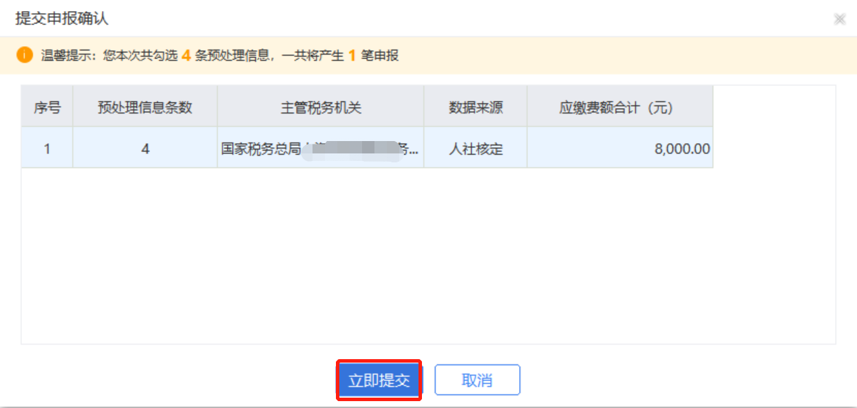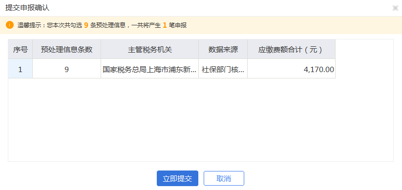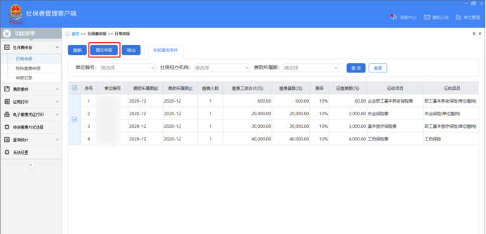 ③选中要申报的行次,核对信息无误后点击“提交申报”。同一批次的社保费需要同时进行申报,选中一条后,系统将自动将此批次其他的险种同时选中。