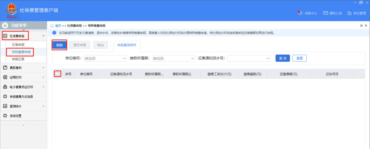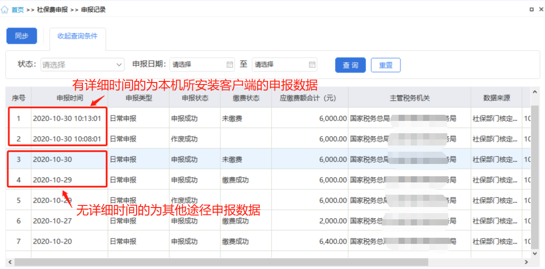 注:如存在特殊缴费类型的社保费,本功能合并展示统一所属期的特殊缴费和按月正常缴费费款。可以通过“数据状态”加以筛选。