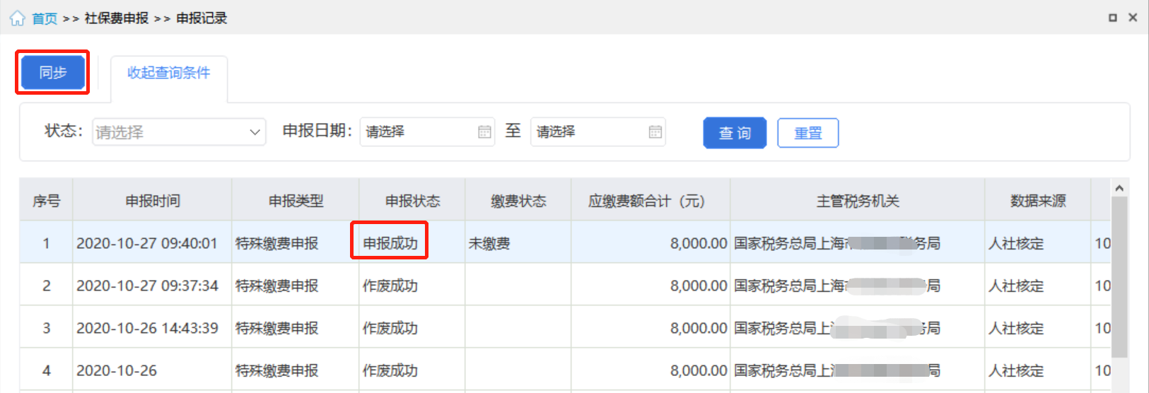 ④如自动获取反馈失败,也可进入【申报记录】界面,点击“同步”。当状态由“作废待反馈”更新为“作废成功”时,表明作废成功;当状态为“作废失败”时,可以再次点击“作废”。