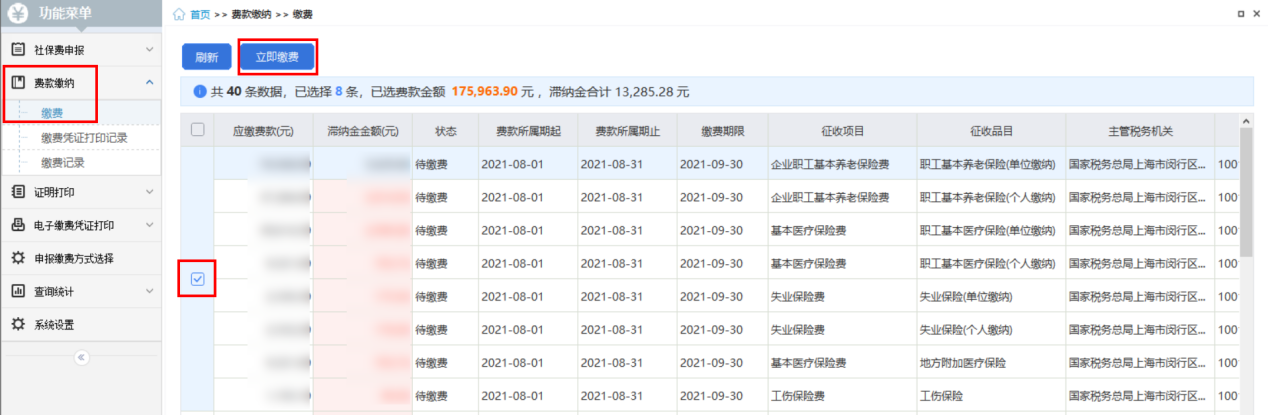 注:如存在特殊缴费类型的社保费,该功能合并展示同一所属期的特殊缴费和按月正常缴费费款。可以通过“数据状态”加以筛选。