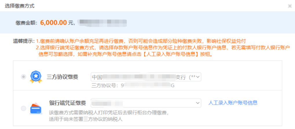 ②选择缴款方式:三方协议缴费或银行端凭证缴费。