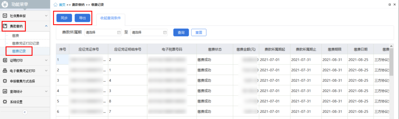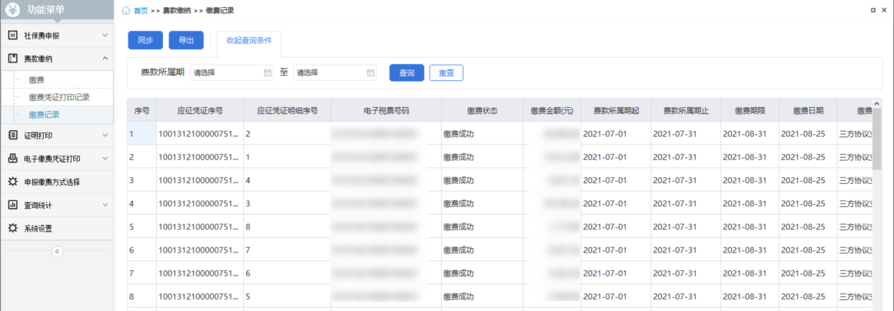 【功能菜单】—【费款缴纳】—【三方协议缴费记录】