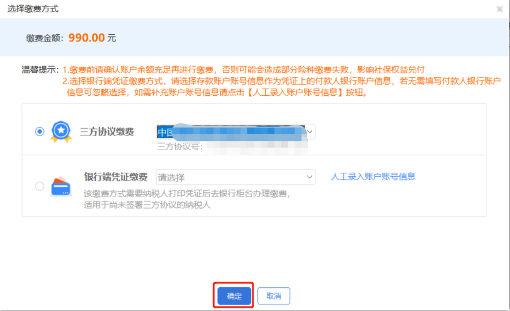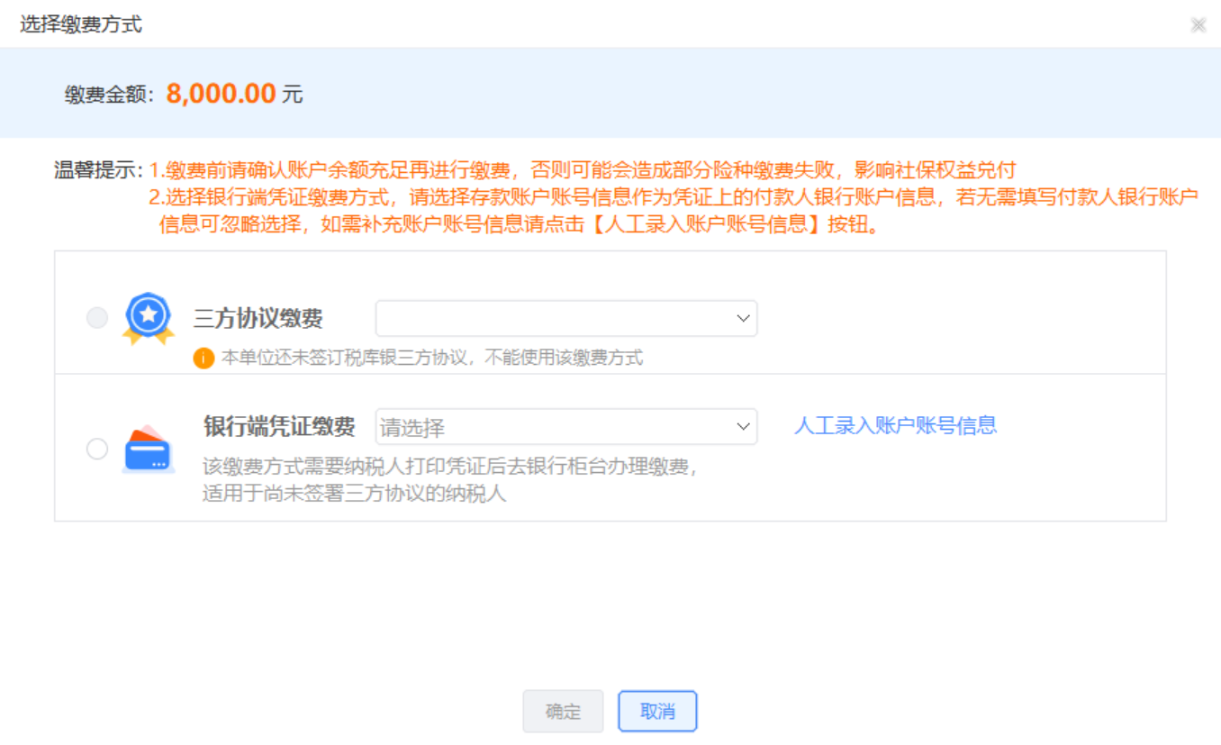 在缴费界面再次确认待缴金额无误后,选择缴款方式,已签订三方协议的企业可选择“三方协议扣款”或者“银行端凭证缴税”,未签订三方协议的企业可选择“银行端凭证缴税”。确认付款方式后,点击确定。