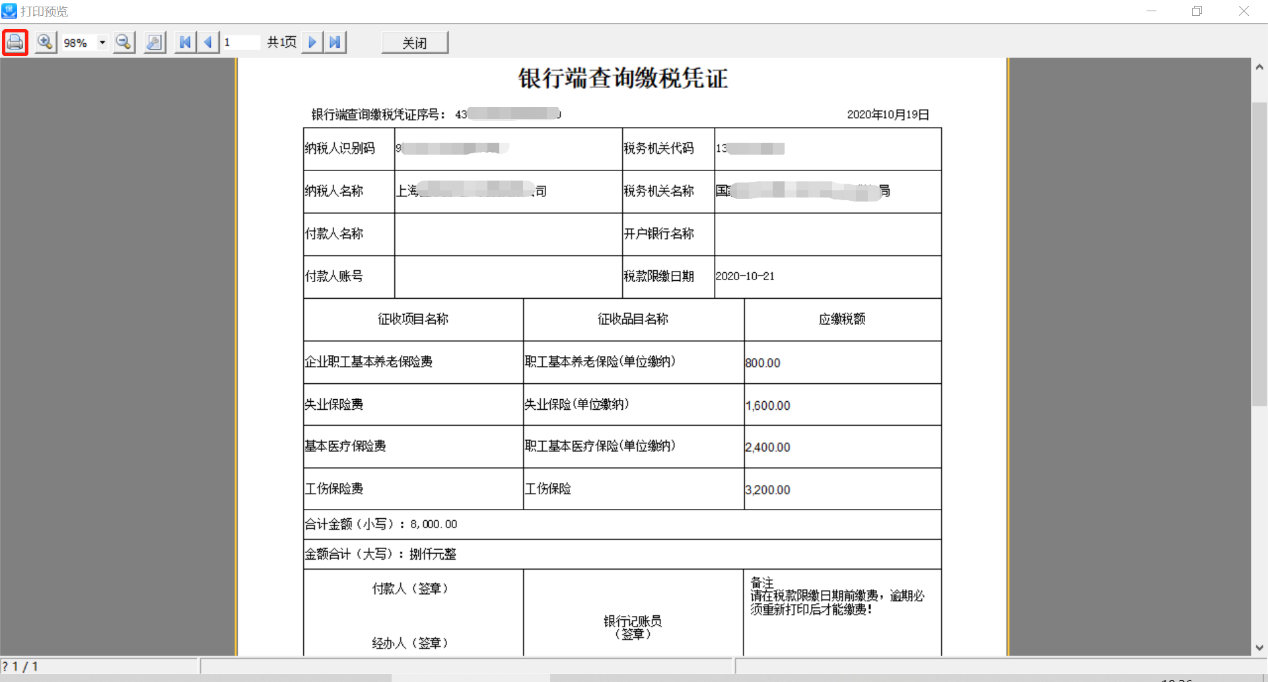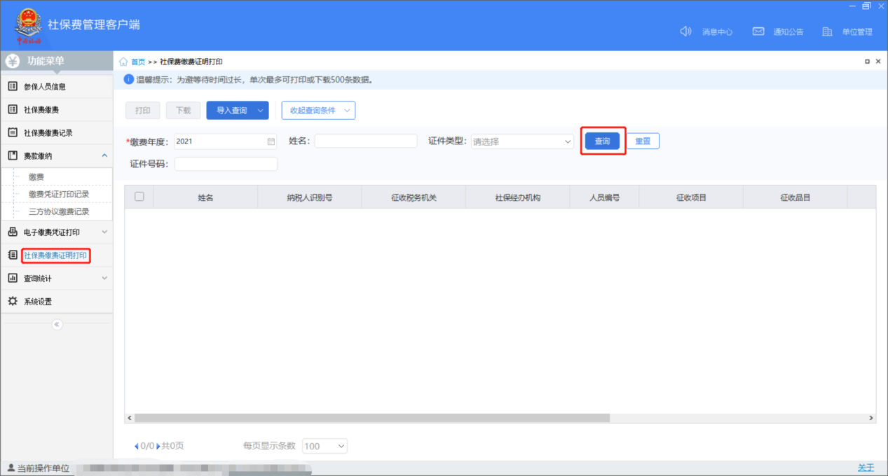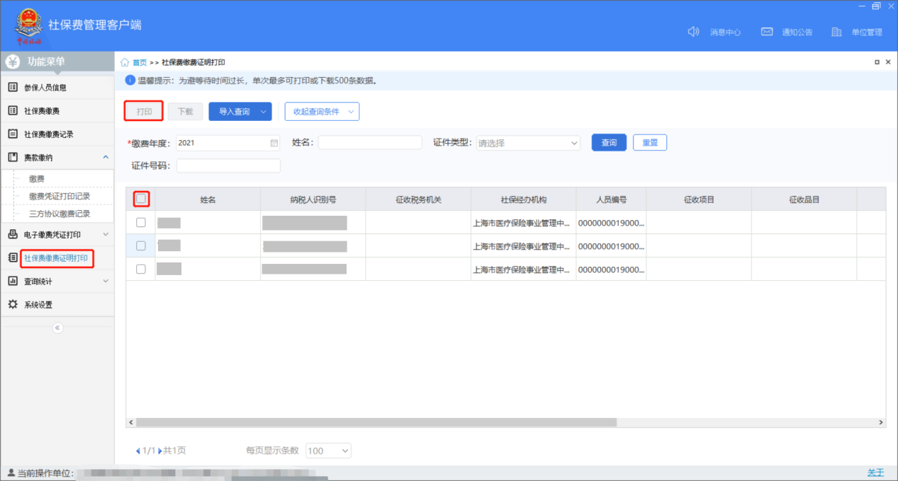 该功能用于打印单位电子缴费凭证,打印前请确认已连接有效的打印机。