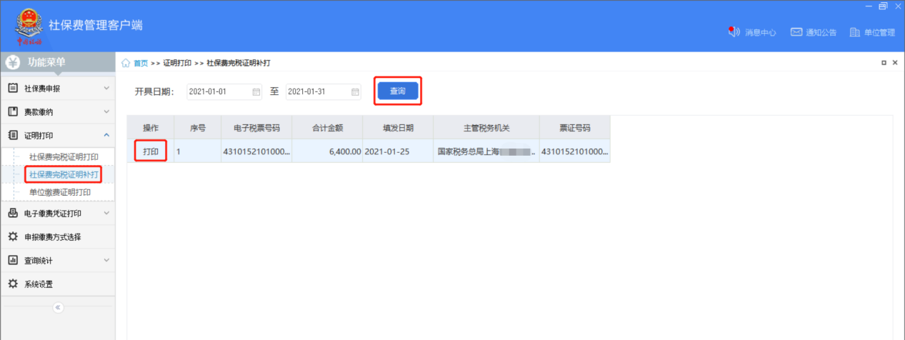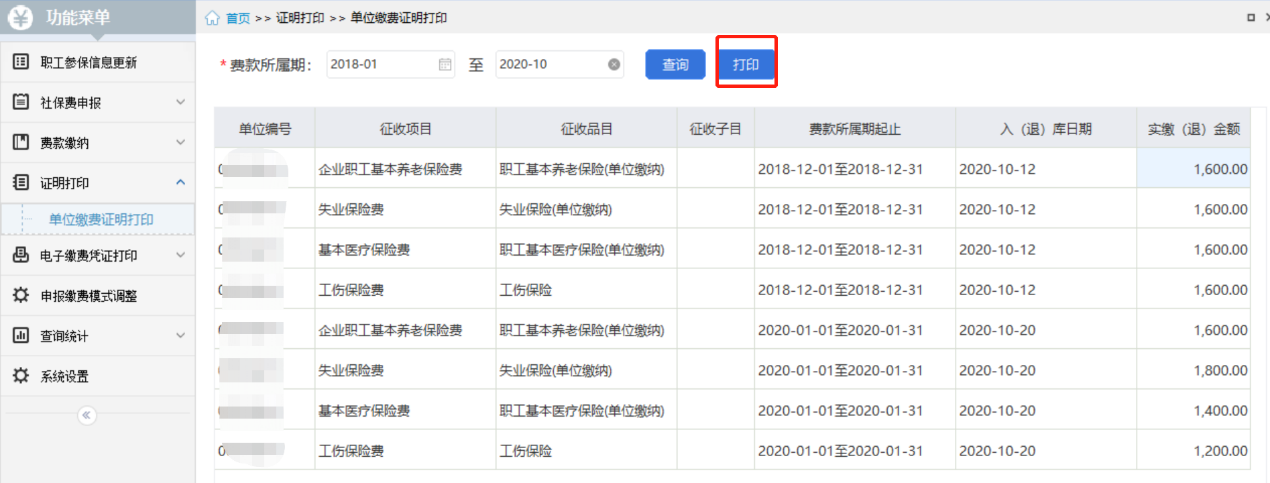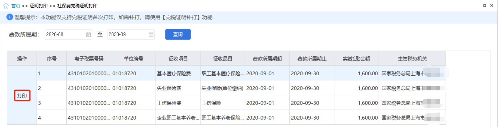 选择需打印证明的费款所属期起止,点击“查询”,系统显示已缴费明细,点击“打印”。