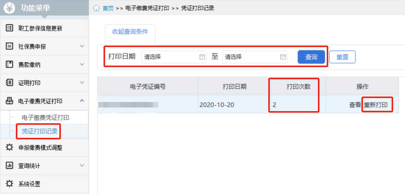 ②进入该界面后,系统自动跳出已打印的电子缴费凭证记录,也可通过打印日期精确选择,选择后日期后,点击“查询”,查询后点击“重新打印”。