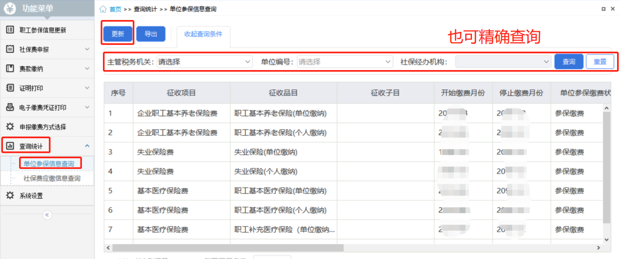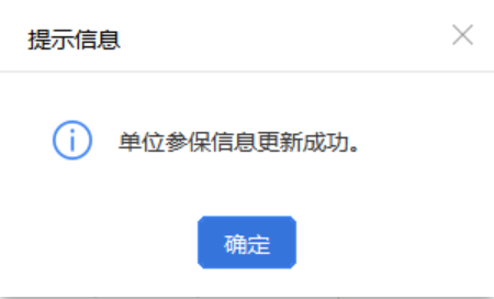 ①点击“单位参保信息查询”,点击“更新”按钮。系统弹出“提示信息”,点击“确认”。