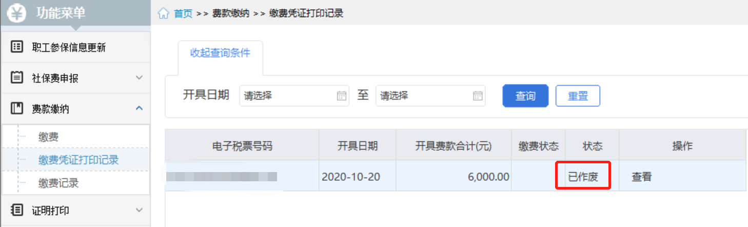 ①进入【缴费凭证打印记录】模块,系统会自动查询已开具的银行端查询缴税凭证;用人单位也可通过“开具日期”精准查询需作废的凭证记录。选择需作废的缴费凭证,点击“作废”。