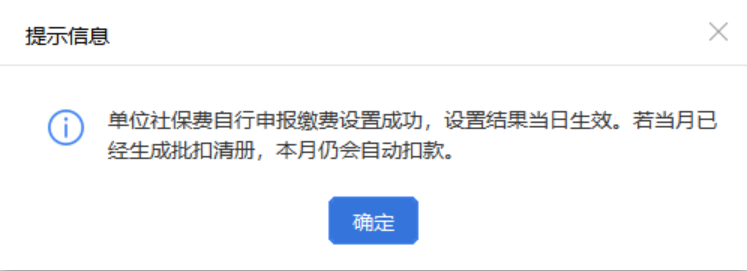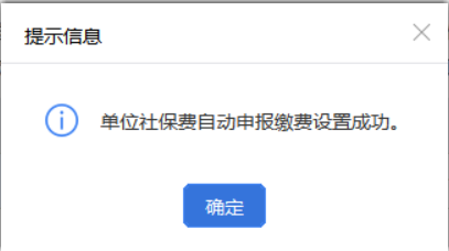 确认后跳出设置成功提示信息,点击“确认”后,系统返回【用人单位申报缴费方式选择】界面,并成功更改缴款方式。