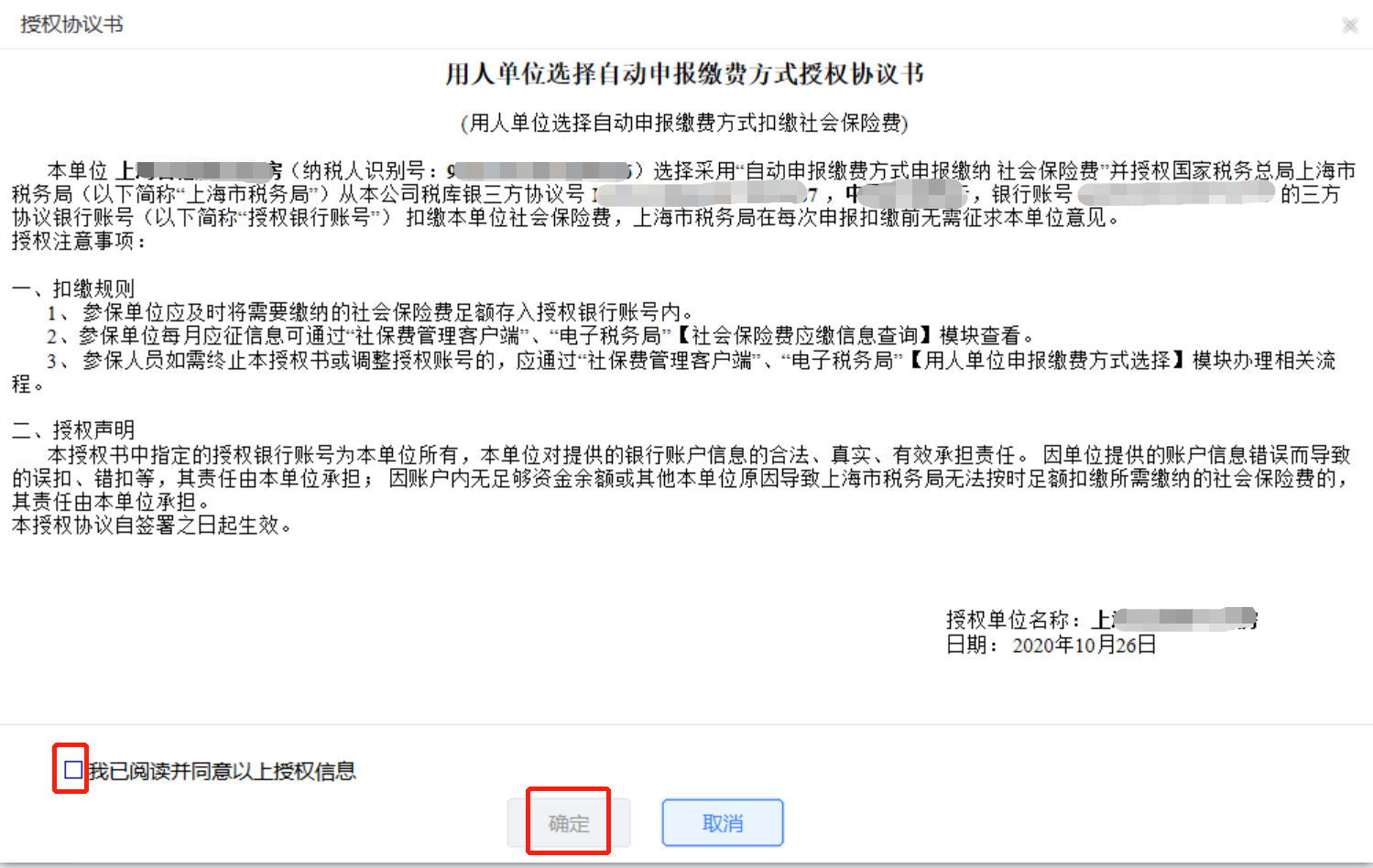 验证后跳出授权协议书,核对单位、银行账号等信息,确认无误后,勾选“我已阅读并同意以上授权信息”,并点击“确认”。