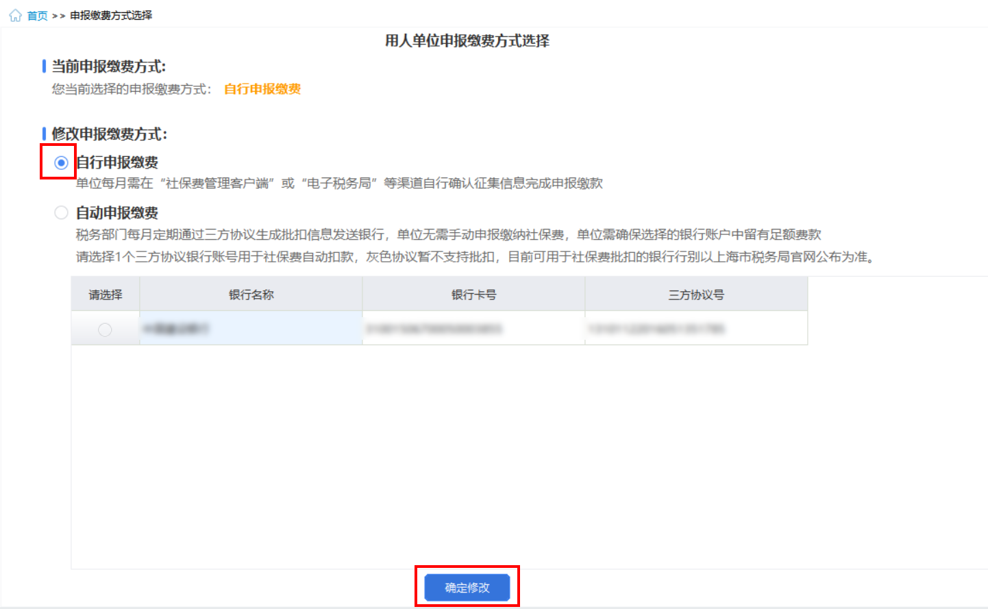 进入申报缴费方式选择界面后,用人单位可查看当前申报缴费方式,也可自主修改。