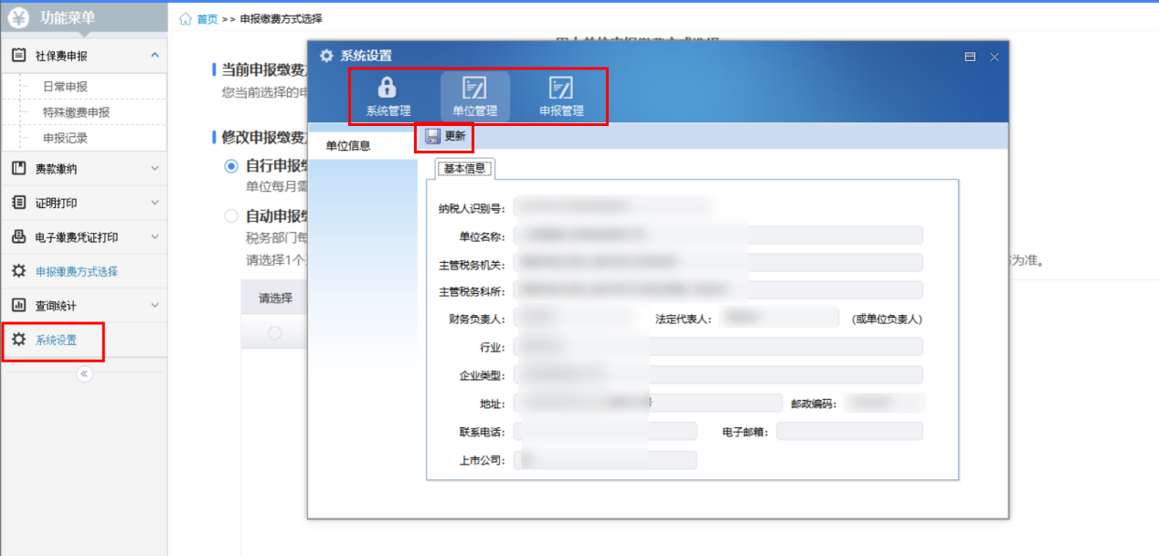 点击【系统设置】模块,选择“单位管理”,点击“更新”,系统显示“更新成功”即可。