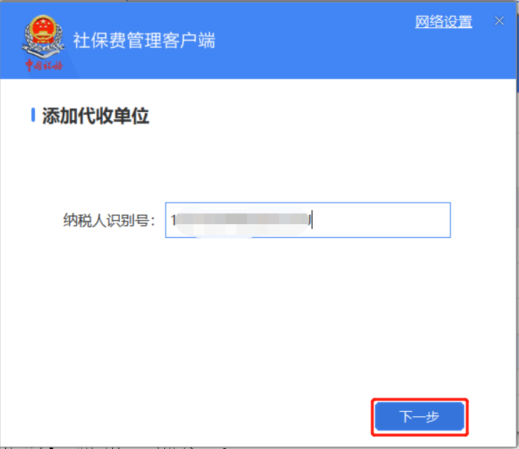 ①添加代收单位。在“纳税人识别号”输入代收单位的纳税人识别号,点击“下一步”;