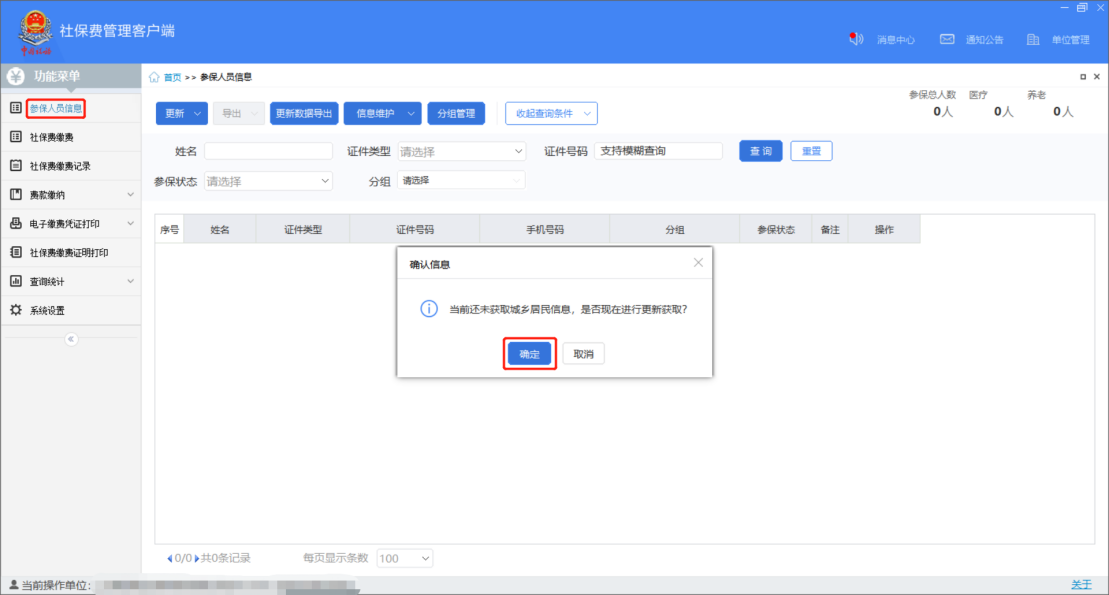 ①点击【参保人员信息】模块,首次登录时,系统自动跳出确认信息,点击“确定”后,系统自动更新获取信息。