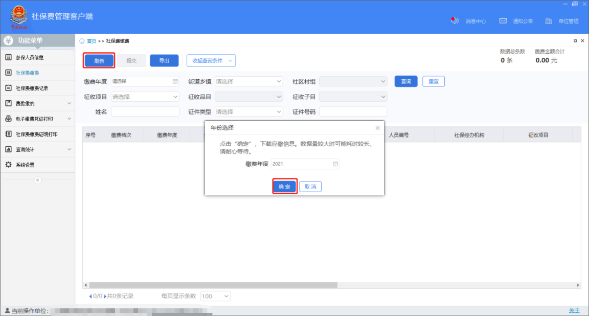 ②点击【社保费缴费】模块,首次登录时,系统自动刷新应缴信息,或手动点击“刷新”,选择缴费年度后点击“确定”。