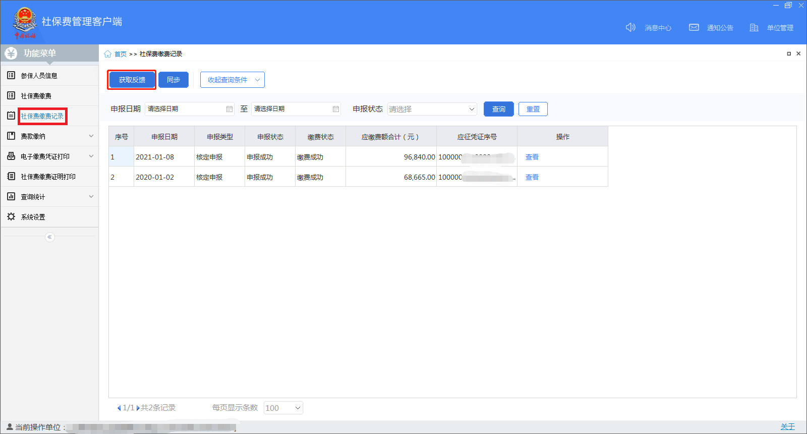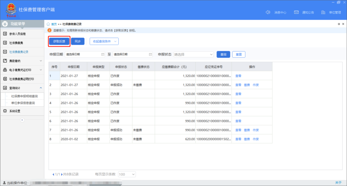 ②如果获取申报结果反馈失败,可点击“获取反馈”。当状态由“待反馈”更新为“申报成功”时,表明申报成功;当状态为“申报失败”时,可以回到【社保费缴费】界面再次发起申报。