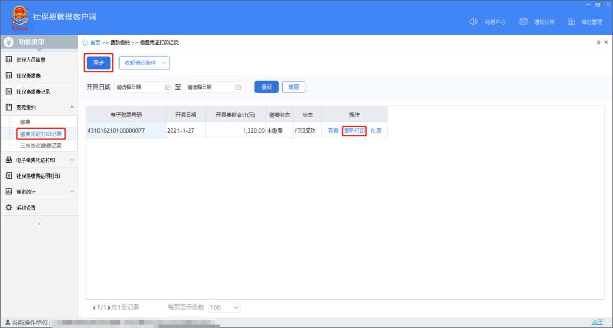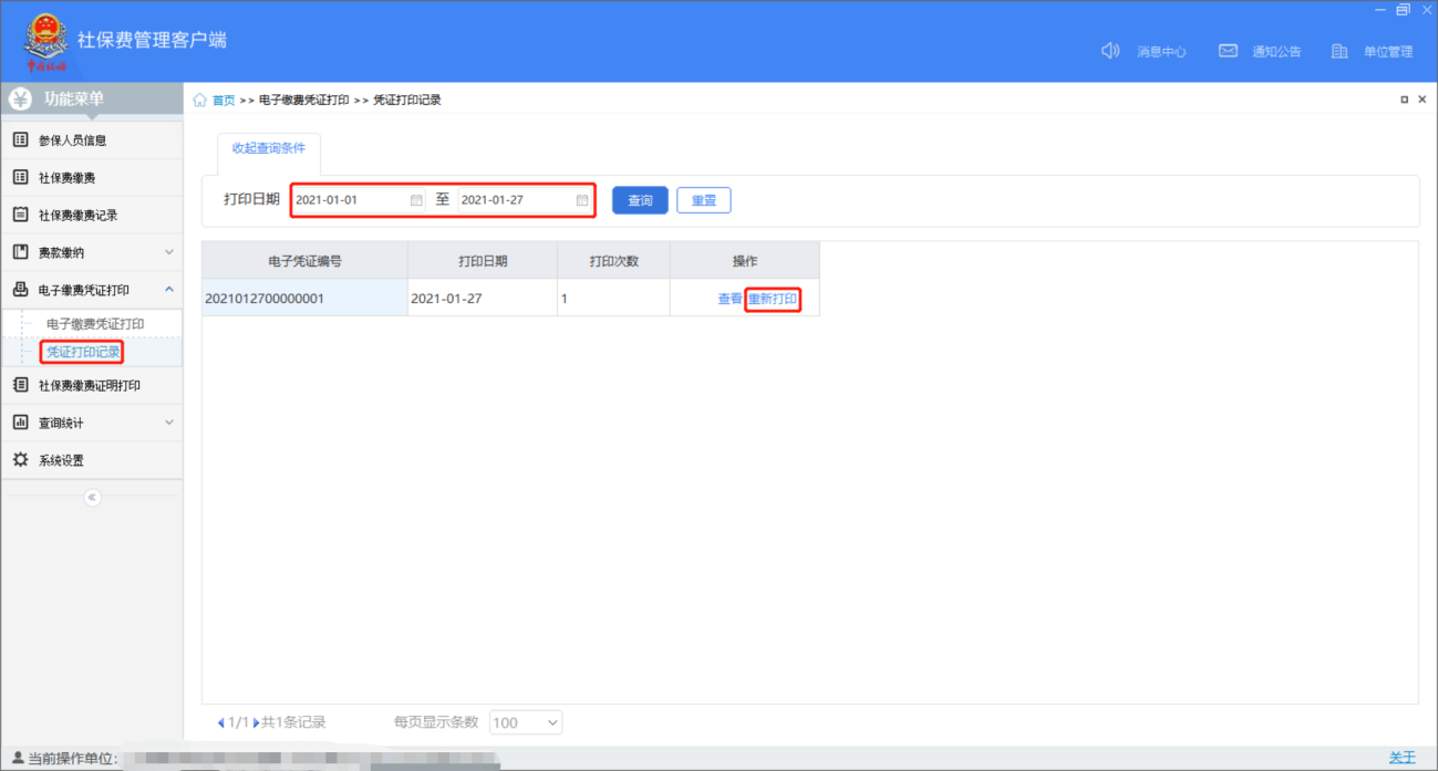 该功能用于查看或重打已打印的单位电子缴费凭证。