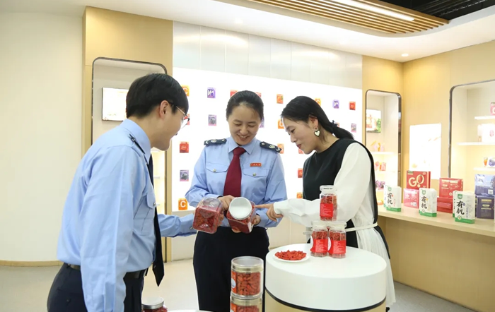 图为宁夏税务干部走进枸杞销售企业,了解经营情况并辅导企业准确适用并享受税费优惠政策。