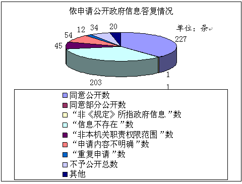 在市局已经答复的454件申请中,“同意公开”的201件,占已经答复总数的44.2%。其他情况253件,其中,“信息不存在”143件,占已经答复总数的31.4%;“非本机关职责权限范围”42件,占已经答复总数的9.2%;“申请内容不明确”38件,占已经答复总数的8.3%;“重复申请”12件,占已经答复总数的2.6%;;“申请人主动撤销”16件,占已经答复总数的3.5%;“非信息公开申请”2件,占已经答复总数的0.4%。