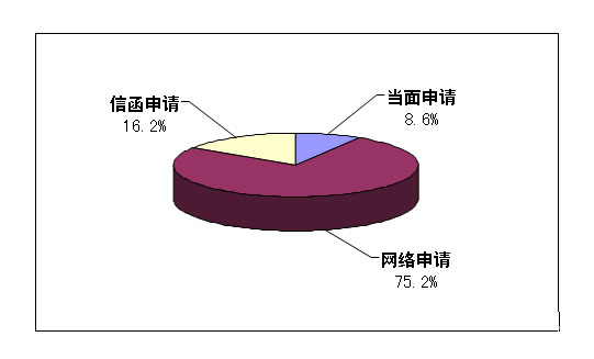 从申请渠道来看,当面申请53件,占总数的8.6%;网络申请464件,占总数的75.2%;信函申请100件,占总数的16.2%。目前,网络申请已成最主要形式。