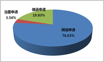 从申请渠道来看,网络申请715件,占总数的76.63%;信函申请185件,占总数的19.83%;当面申请33件,占总数的3.54%。网络申请已成为最主要的申请形式。
