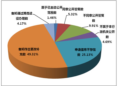 在全市税务机关答复的959件申请中,“属于已主动公开范围”14件,占总数的1.46%;“同意公开”51件,占总数的5.32%;“不同意公开”95件,占总数的9.91%;“不属于本行政机关公开”45件,占总数的4.69%;“申请信息不存在”241件,占总数的25.13%;“告知作出更改补充”473件,占总数的49.32%;“告知通过其他途径办理数”40件,占总数的4.17%。