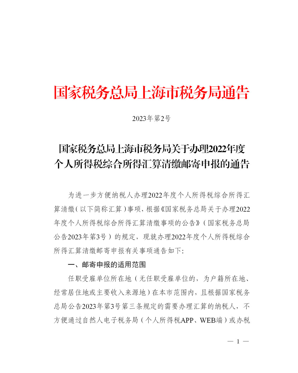 名称: 关于办理2022年度个人所得税综合所得汇算清缴邮寄申报的通告