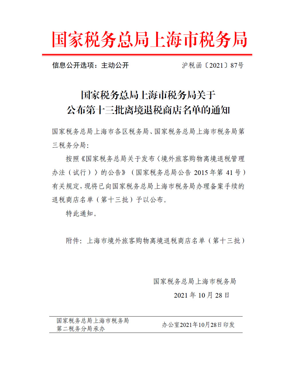 按照《国家税务总局关于发布〈境外旅客购物离境退税管理办法(试行)〉的公告》(国家税务总局公告 2015年第 41号)有关规定,现将已向国家税务总局上海市税务局办理备案手续的退税商店名单(第十三批)予以公布。