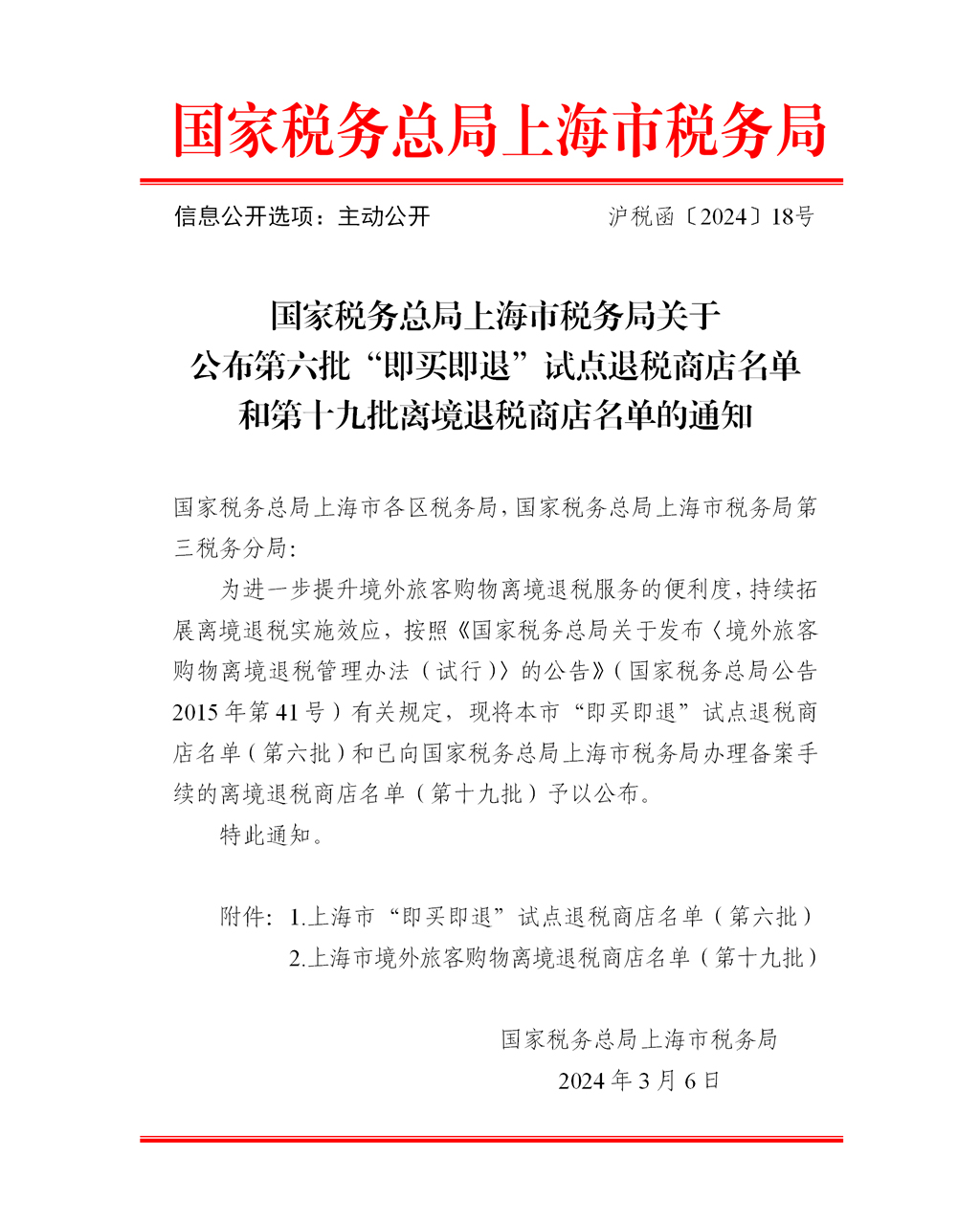 名称: 关于公布第六批“即买即退”试点退税商店名单和第十九批离境退税商店名单的通知