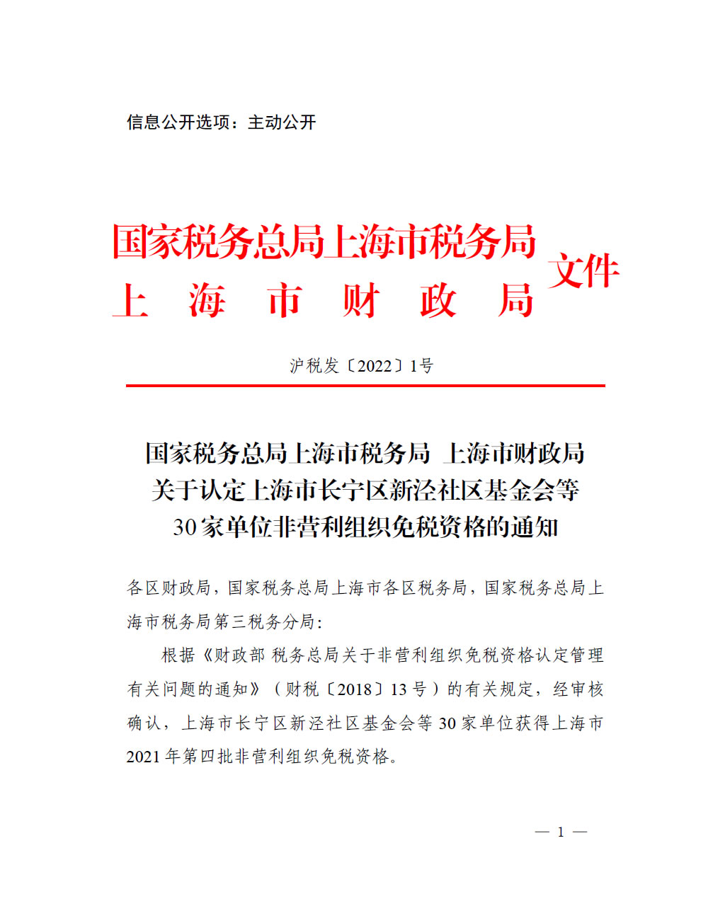根据《财政部 税务总局关于非营利组织免税资格认定管理有关问题的通知》(财税〔2018〕13号)的有关规定,经审核确认,上海市长宁区新泾社区基金会等30家单位获得上海市2021年第四批非营利组织免税资格。