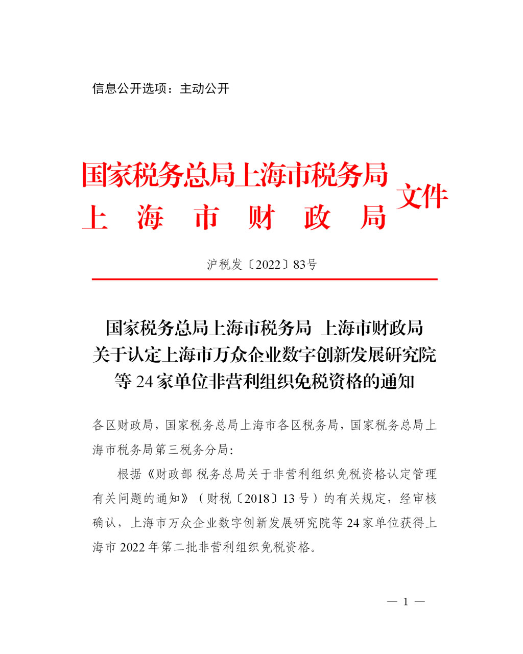 根据《财政部 税务总局关于非营利组织免税资格认定管理有关问题的通知》(财税〔2018〕13号)的有关规定,经审核确认,上海市万众企业数字创新发展研究院等24家单位获得上海市2022年第二批非营利组织免税资格。