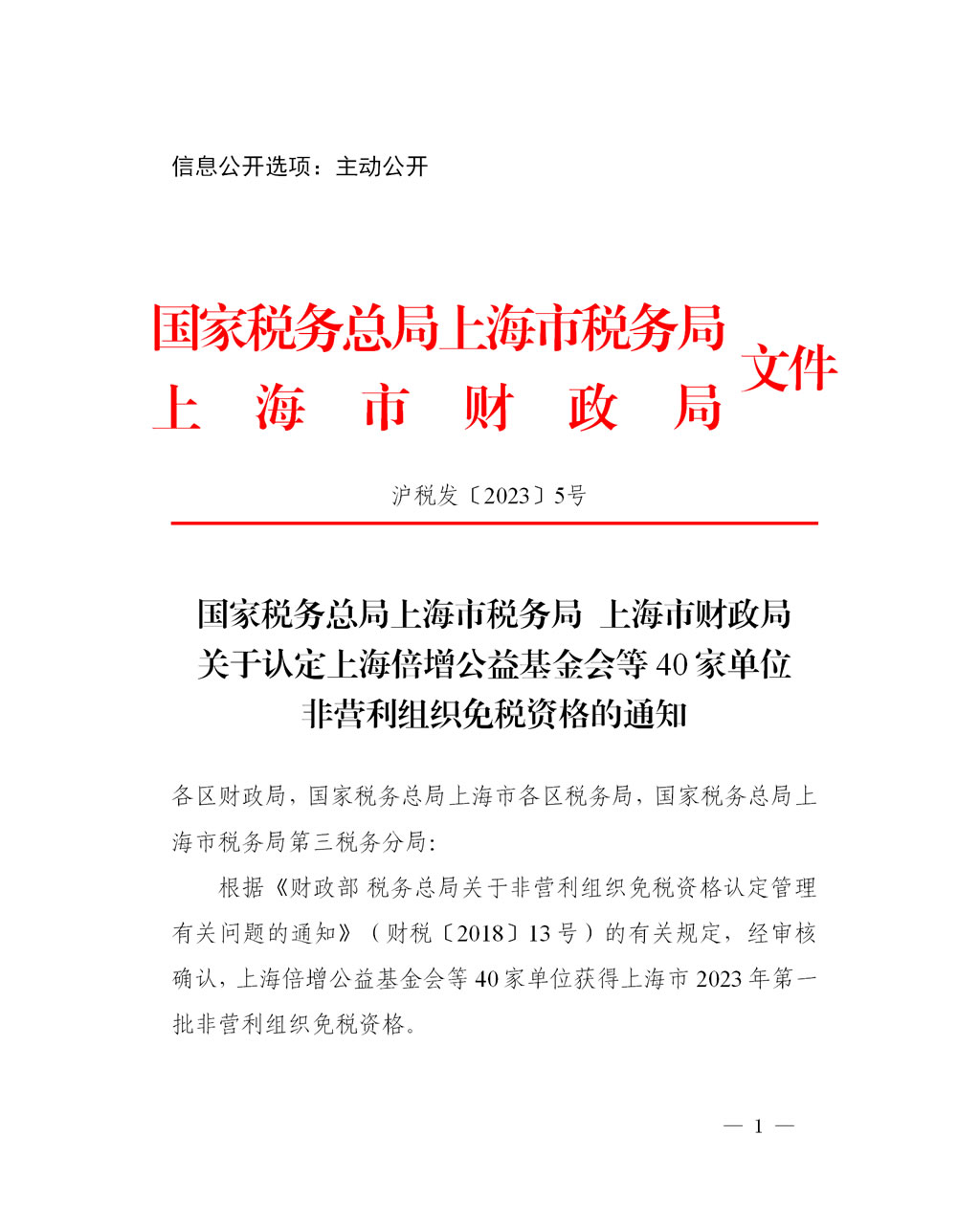 根据《财政部 税务总局关于非营利组织免税资格认定管理有关问题的通知》(财税〔2018〕13号)的有关规定,经审核确认,上海倍增公益基金会等40家单位获得上海市2023年第一批非营利组织免税资格。