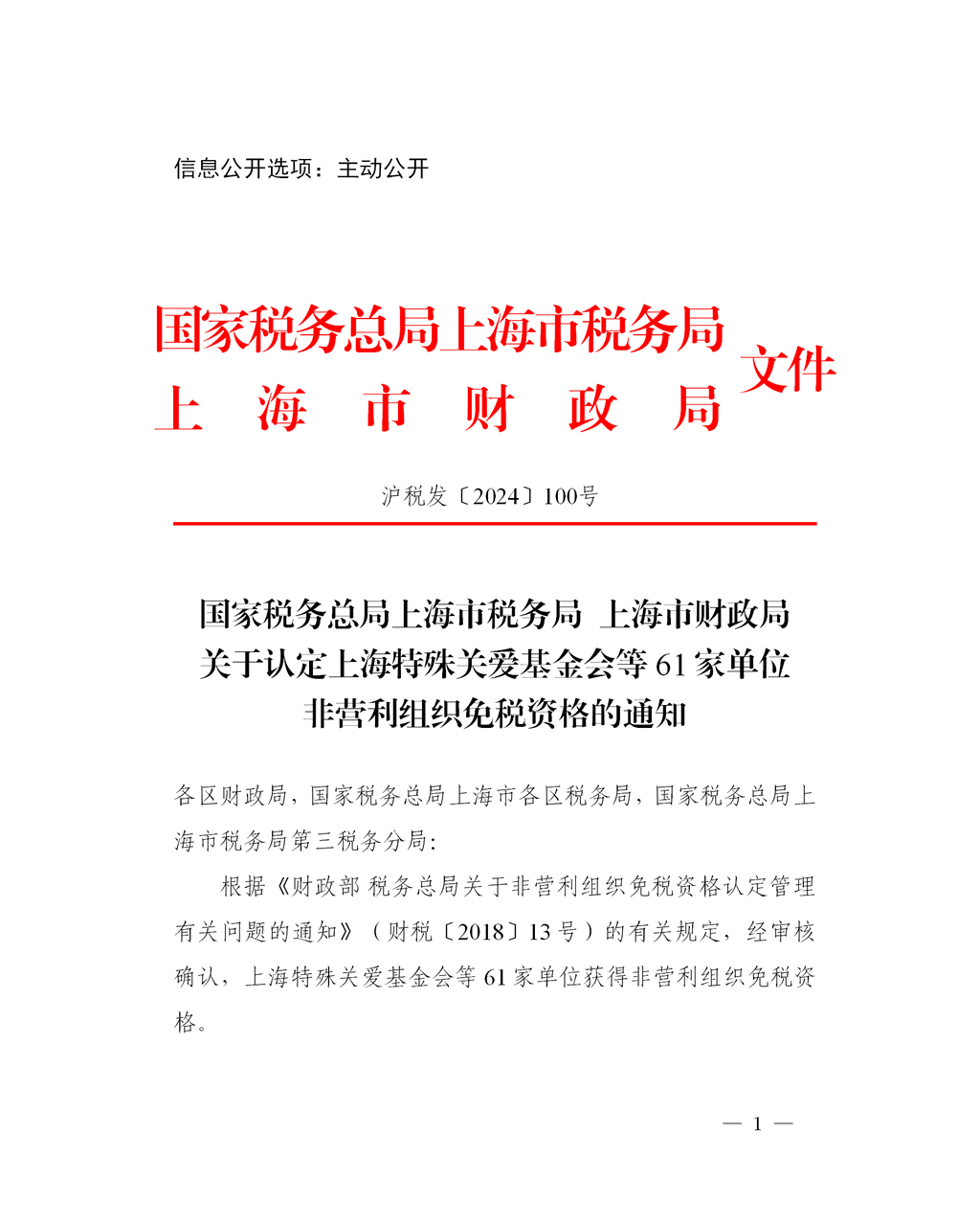 根据《财政部 税务总局关于非营利组织免税资格认定管理有关问题的通知》(财税〔2018〕13号)的有关规定,经审核确认,上海特殊关爱基金会等61家单位获得非营利组织免税资格。