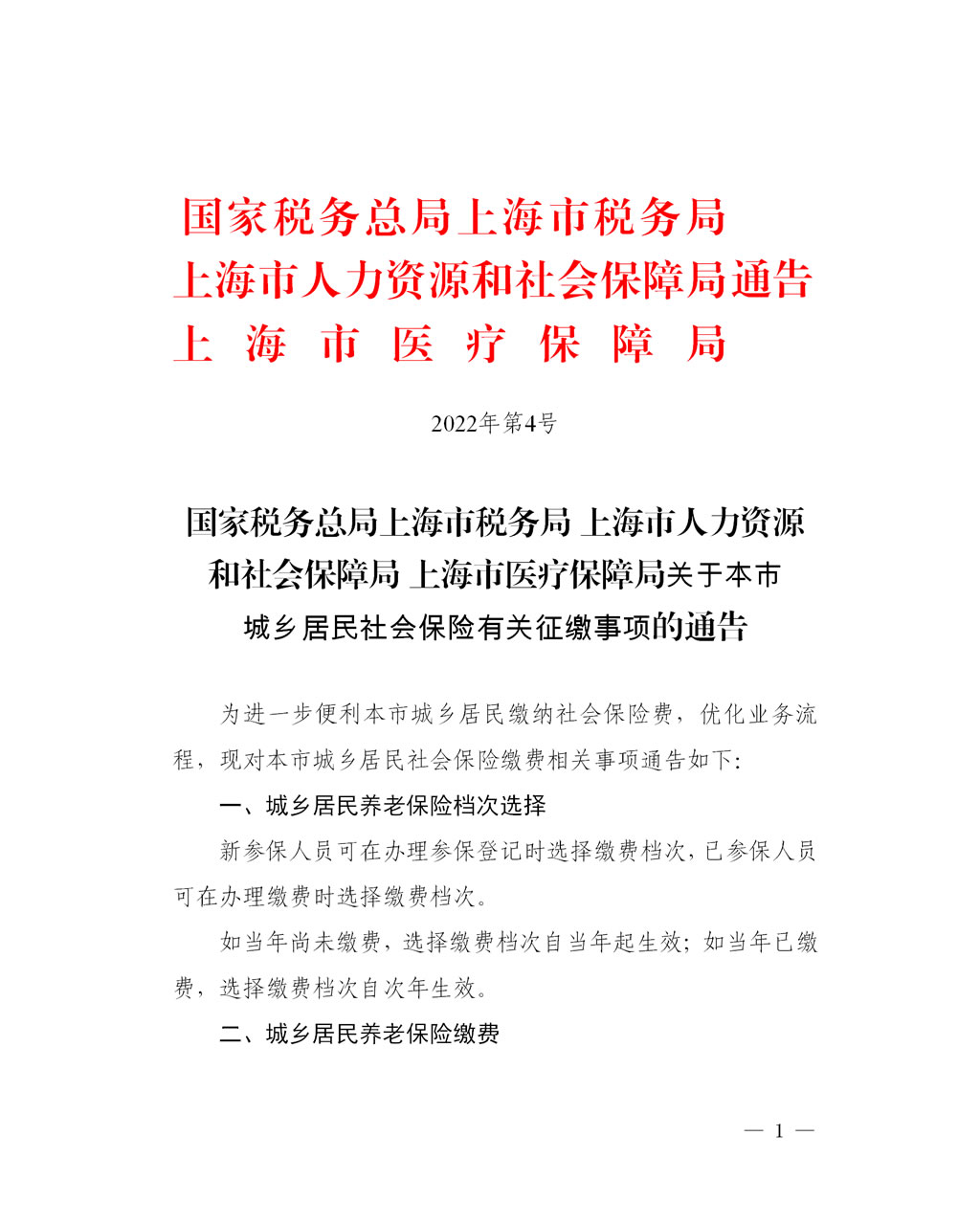 文号:国家税务总局上海市税务局 上海市人力资源和社会保障局 上海市医疗保障局通告2022年第4号