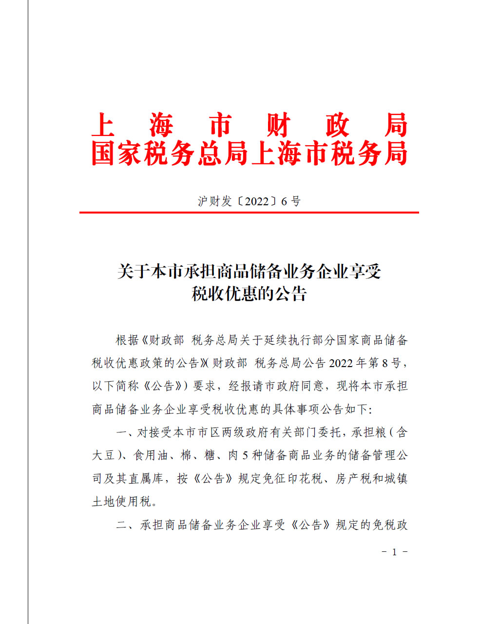 根据《财政部 税务总局关于延续执行部分国家商品储备税收优惠政策的公告》(财政部 税务总局公告2022年第8号,以下简称《公告》)要求,经报请市政府同意,现将本市承担商品储备业务企业享受税收优惠的具体事项公告如下: