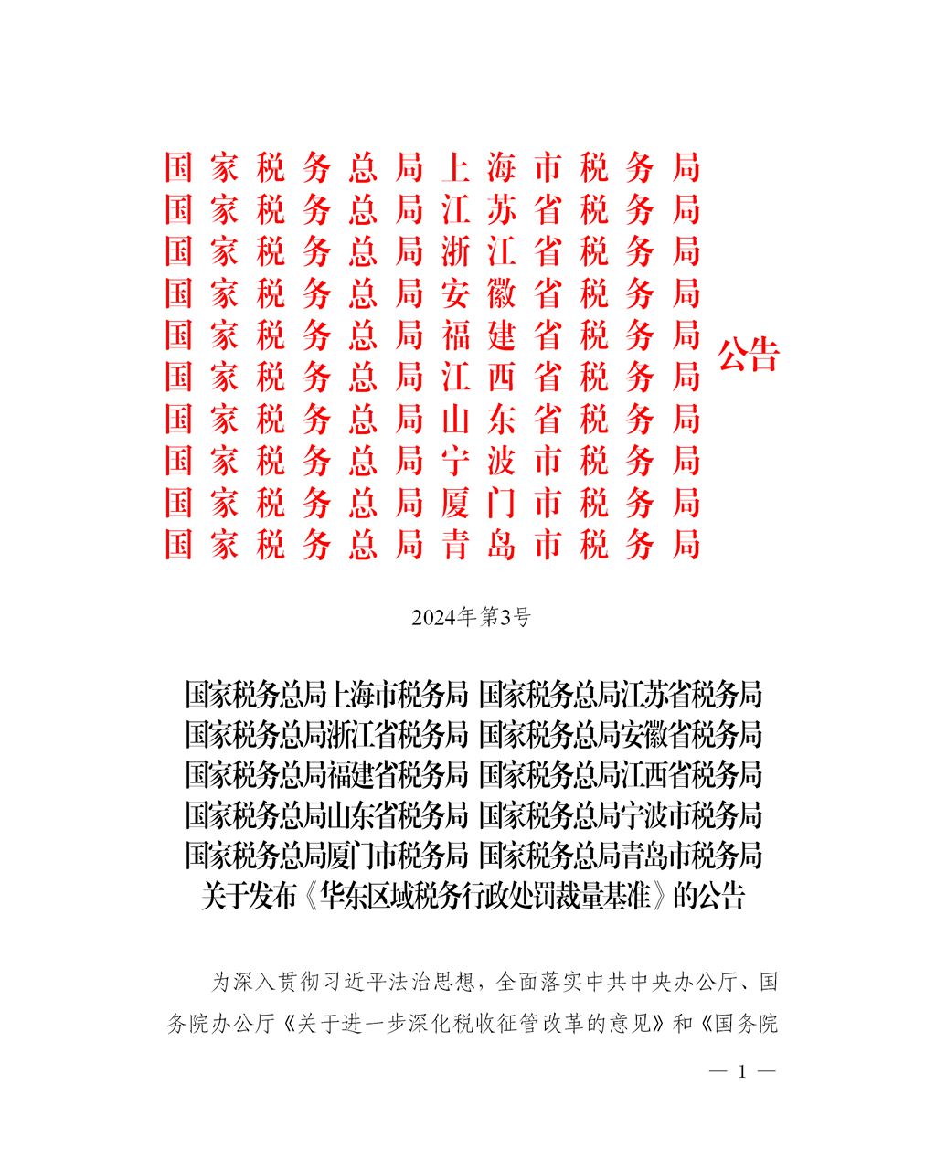 为深入贯彻习近平法治思想,全面落实中共中央办公厅、国务院办公厅《关于进一步深化税收征管改革的意见》和《国务院办公厅关于进一步规范行政裁量权基准制定和管理工作的意见》(国办发〔2022〕27号),进一步规范税务行政处罚裁量权行使,切实保障税务行政相对人合法权益,推进区域执法标准统一,根据《中华人民共和国行政处罚法》、《中华人民共和国税收征收管理法》及其实施细则、《中华人民共和国发票管理办法》及其实施细则、《税务登记管理办法》(国家税务总局令第7号公布,第36号、第44号、第48号修改)等法律、法规和规章的规定,结合华东区域税务执法实际,制定《华东区域税务行政处罚裁量基准》,现予以发布。