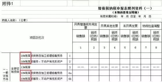 由于17%和11%的增值税税率分别调整为16%、10%,相应地,申报表上17%、11%税率所在栏次调整为16%和10%税率。