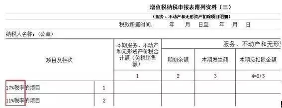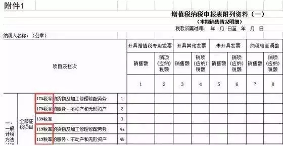 讲到这里,大家可能有个小疑问,增值税申报表里,关于销售额和销项税额,17%、11%的税率不见了!肿么办?如果从6月份开始申报时,有申报适用17%、11%的应税项目的情况,申报表应当怎么填?